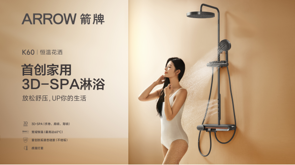 SPA 级沐浴体验;K60 3D-SPA 花洒则配备肩喷、背喷功能,感温灯显设计让水温直观可见,即关即停技术告别滴水烦恼。