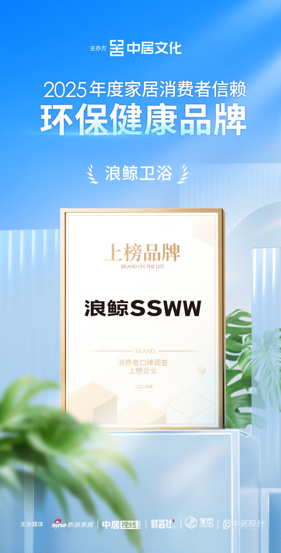 在本次评选中,浪鲸卫浴凭借优越的产品质量、良好的消费者口碑,获得消费者和行业的高度认可,从上百家家居品牌脱颖而出,荣膺「2025年度家居消费者信赖环保健康品牌」称号。