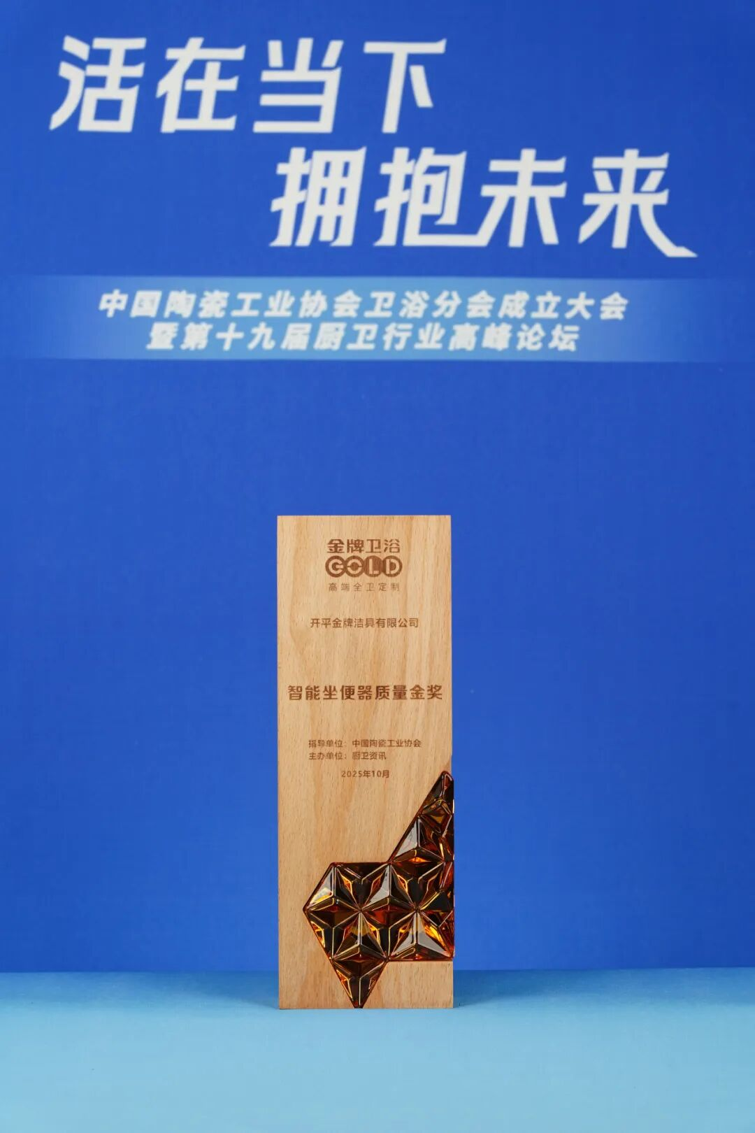 10月16日,由中国陶瓷工业协会指导、厨卫资讯主办的 “中国陶瓷工业协会卫浴分会成立大会暨第十九届厨卫行业高峰论坛”,在佛山圆满举办!作为中国陶瓷工业协会卫浴分会常务副会长单位,金牌卫浴受邀出席本次行业盛会,与头部品牌、专家学者共探行业发展新路径,更凭借智能坐便器的过硬品质,从众多品牌中脱颖而出,斩获 “2025KBB厨卫榜・智能坐便器质量金奖”,彰显品牌硬核实力。