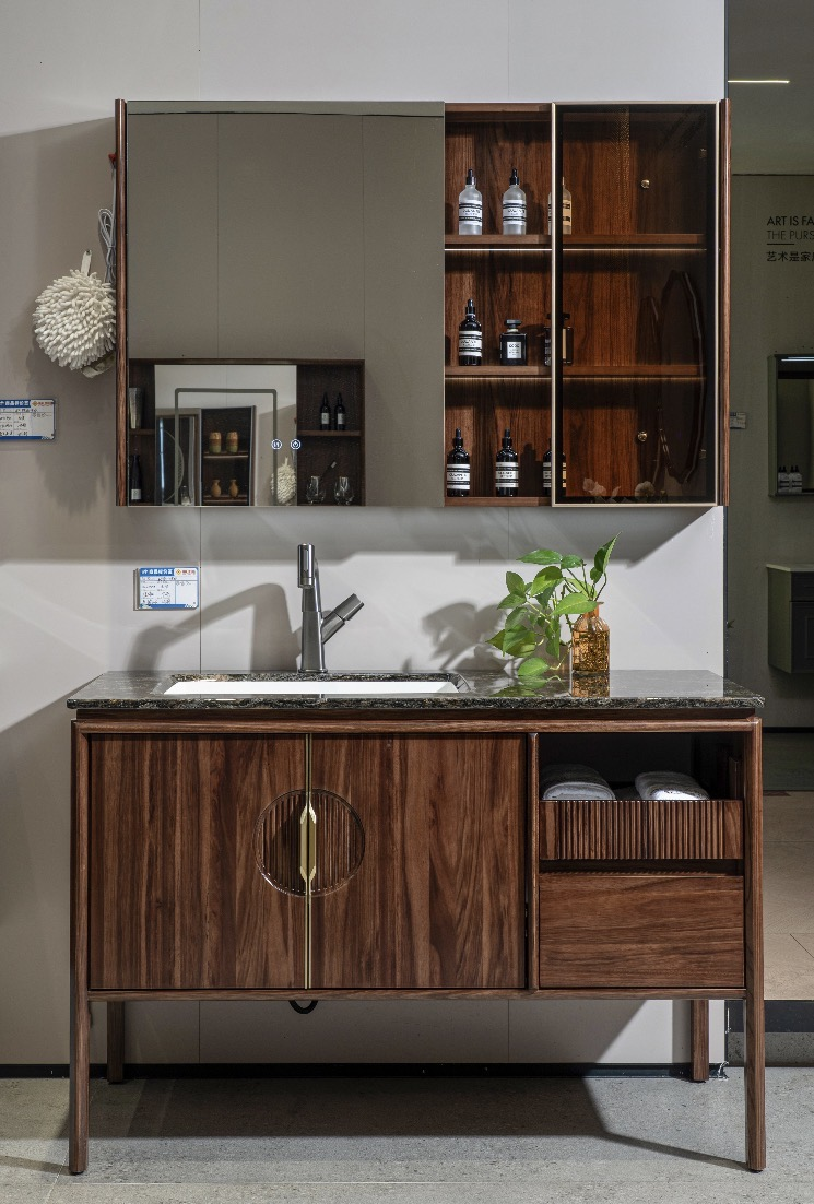 比如,针对乌金木材质,欧兰特将油漆工艺升级为4道工序,以底得宝防潮底漆+对应色透明腻子封底+两遍高透底漆+原色精调色喷涂的组合拳,构建起四维防护体系,一举解决木质产品的耐久性难题,并为实木高定浴室柜带来更丰富、更有质感的美学呈现。