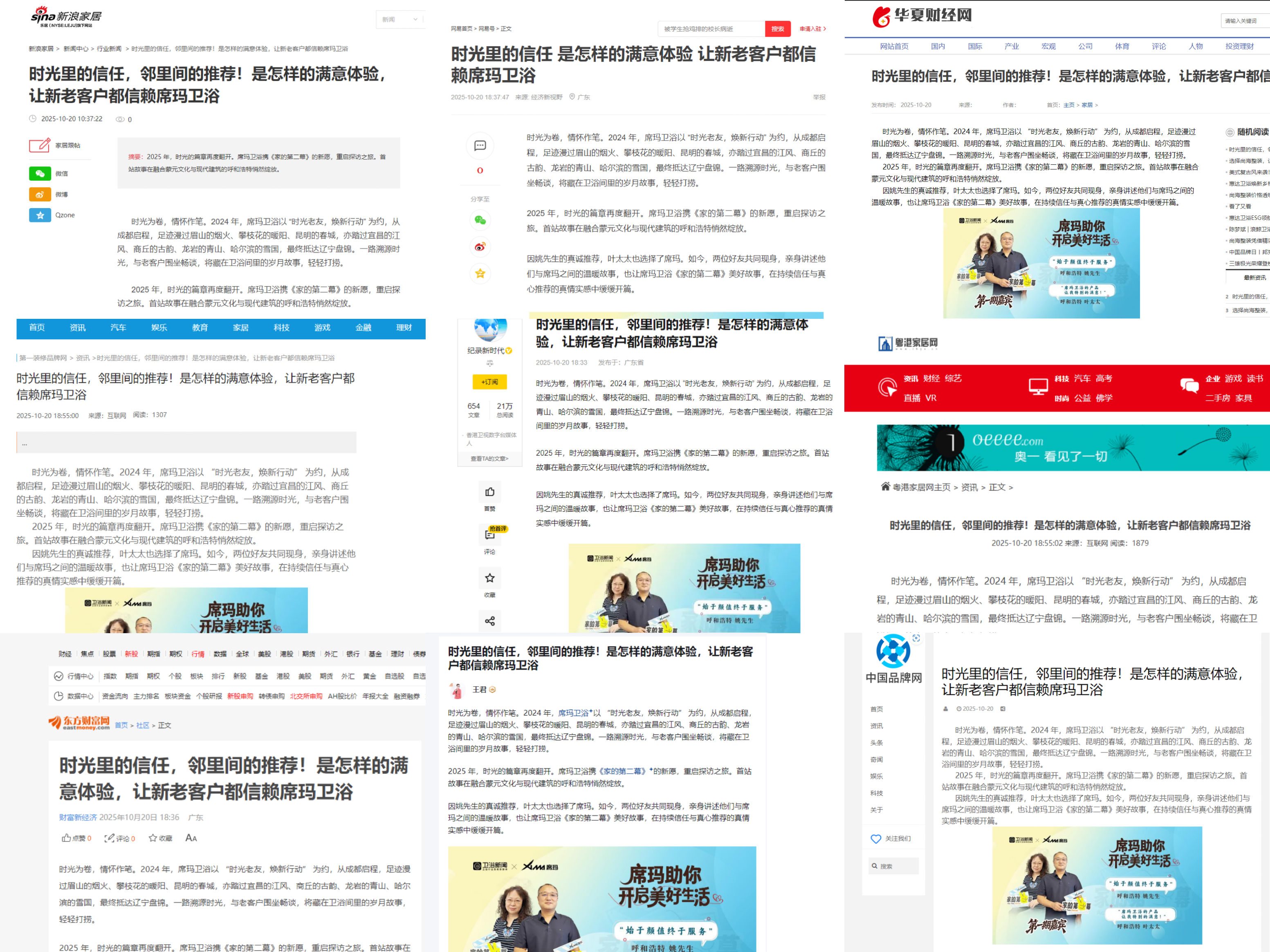 近日,席玛卫浴《家的第二幕》探访之旅首站在呼和浩特圆满落幕,姚先生与叶太太因信任结缘、真诚推荐的暖心故事,引发行业广泛关注。搜狐、今日头条、卫浴新闻、香港电视台等百家主流媒体纷纷聚焦报道,以《时光里的信任,邻里间的推荐!是怎样的满意体验,让新老客户都信赖席玛卫浴》一文为核心,从产品定制实力、细节设计巧思到贴心售后服务等多个维度,全方位为席玛卫浴造势,让这个深耕卫浴领域的品牌再次成为大众热议的焦点。