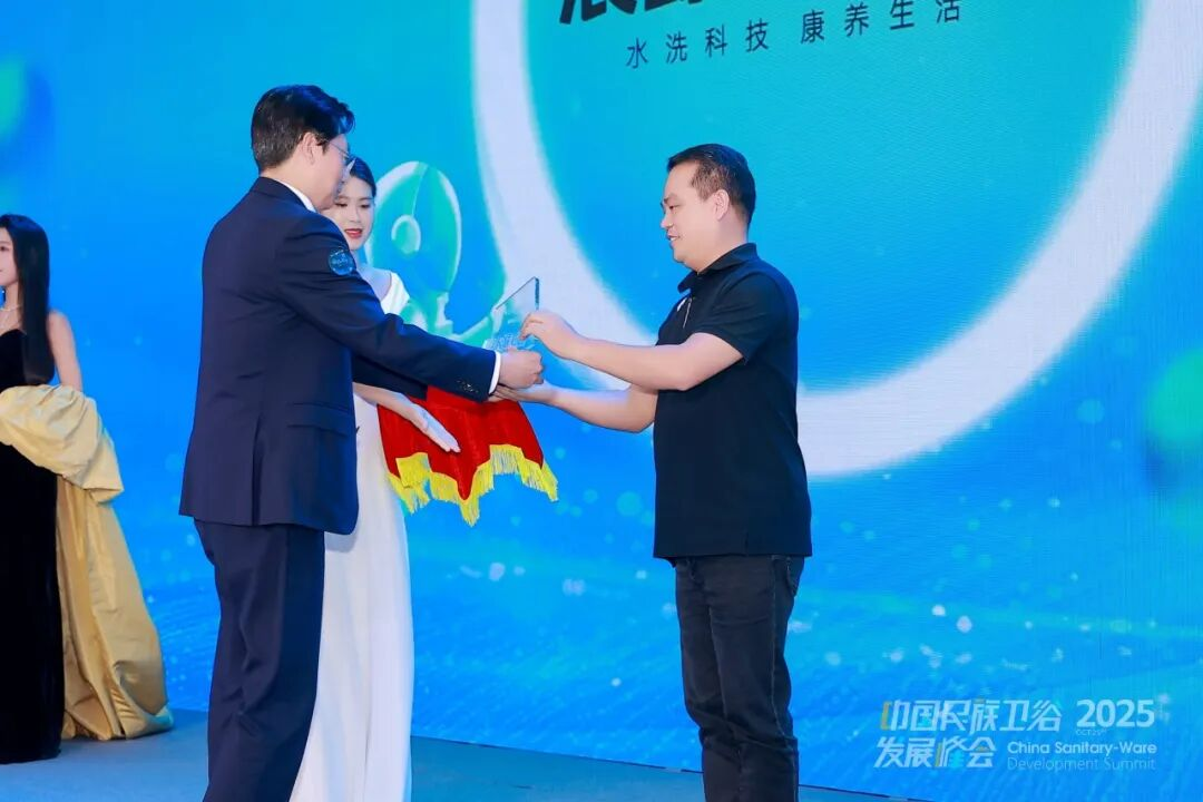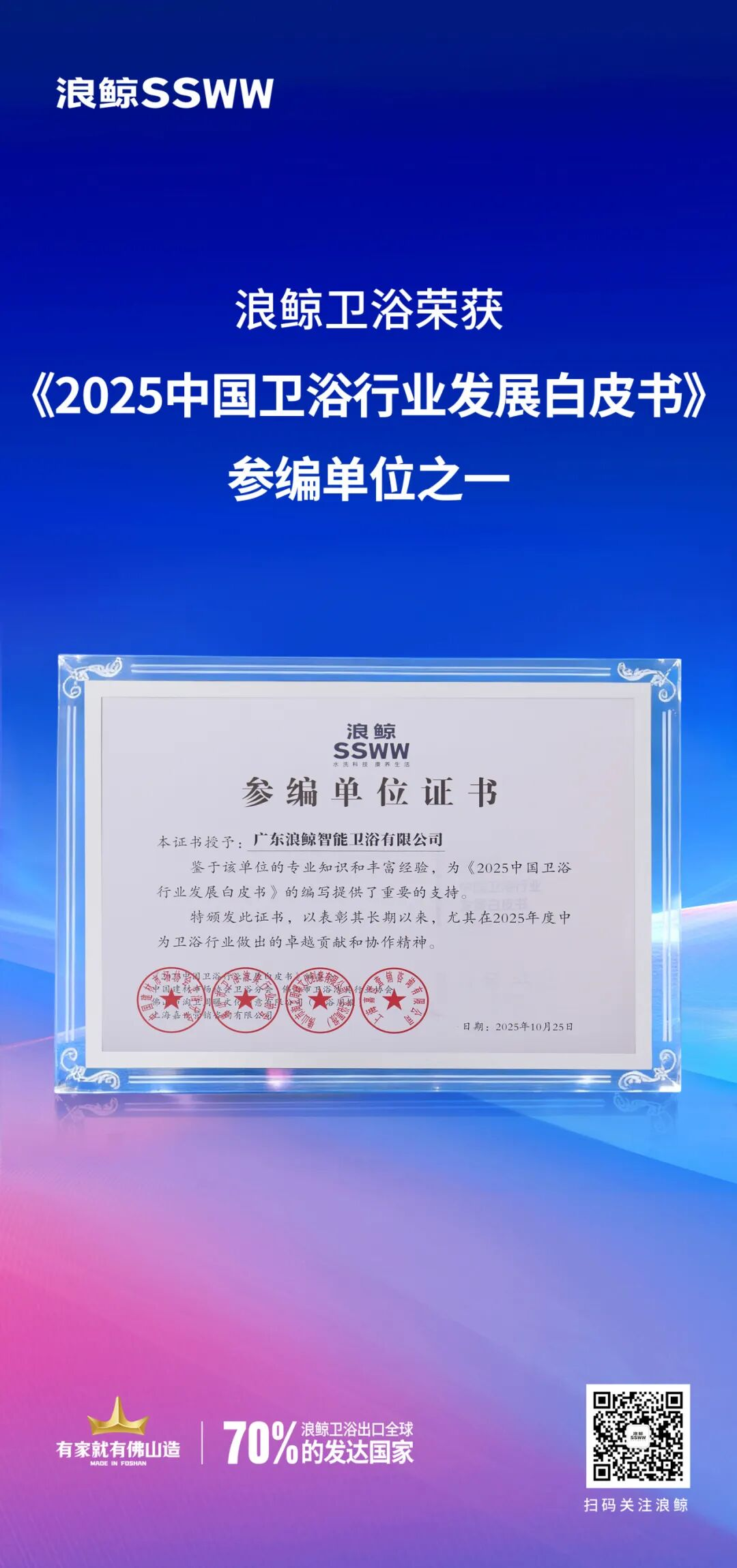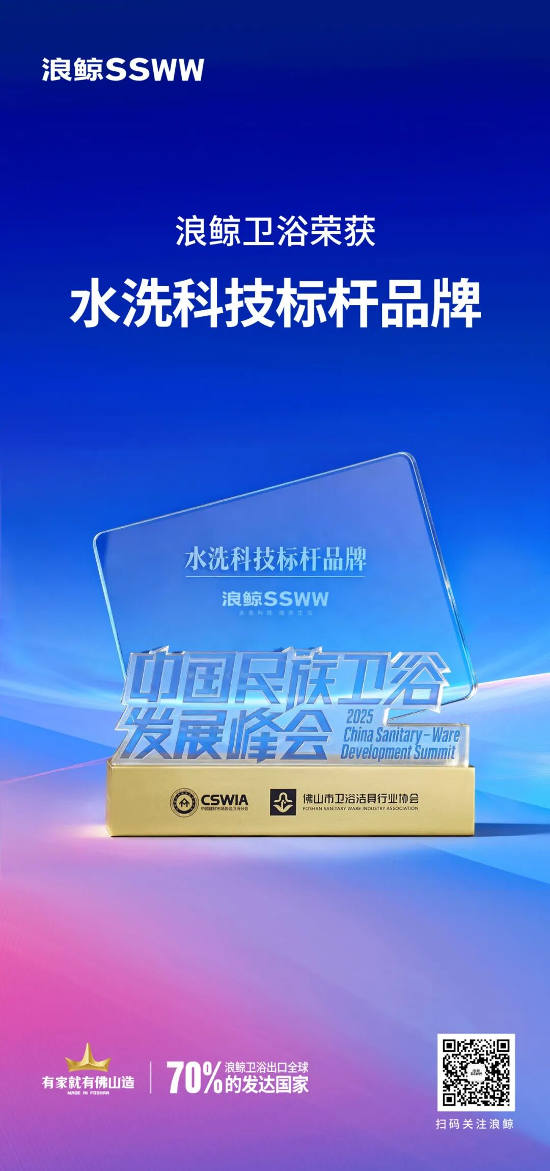 10月25日,2025中国民族卫浴发展峰会在广东佛山盛大召开。会上,浪鲸卫浴凭借卓越的品牌实力荣获“水洗科技标杆品牌”,并以行业专业知识和经验成为《2025中国卫浴行业发展白皮书》及《浴室柜智能镜电源技术要求》团体标准参编单位之一。