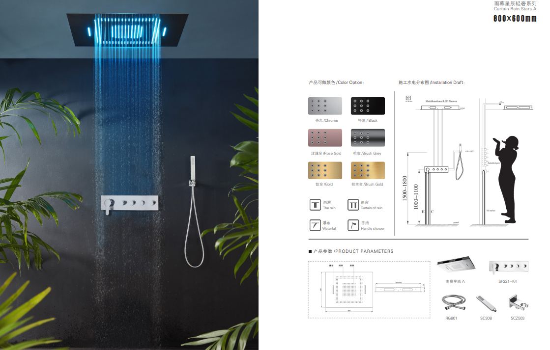 浴旺家装别墅酒店智能暗装嵌入式音乐情调LED淋浴花洒雨幕星辰800*600A套装