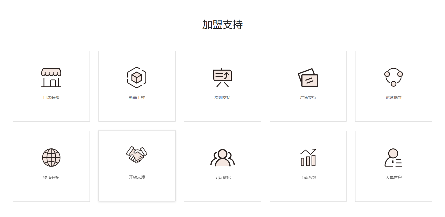 门店装修、新品上样、培训、广告支持、运营指导、渠道开拓、开店支持、团队孵化、主动营销、大单客户协助,覆盖建店、运营、拓客、盈利全流程,让你创业路上不孤单!
