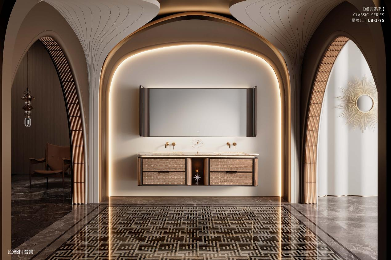 在风格创新上,2025年劳宾引入 Art Deco 装饰主义风格,通过几何形状的重复组合、丰富色彩与多元材质的碰撞,打造出富有节奏感、秩序感与视觉冲击力的产品,打破传统浴室家具的风格局限。