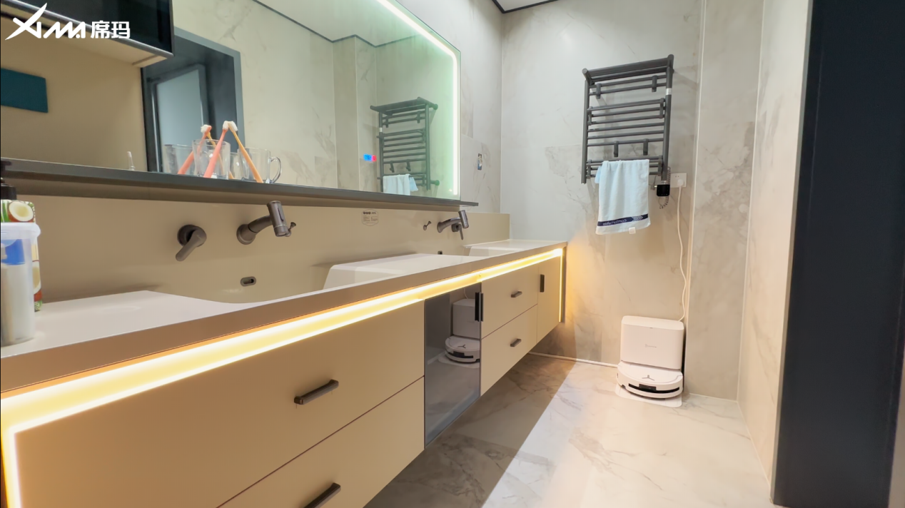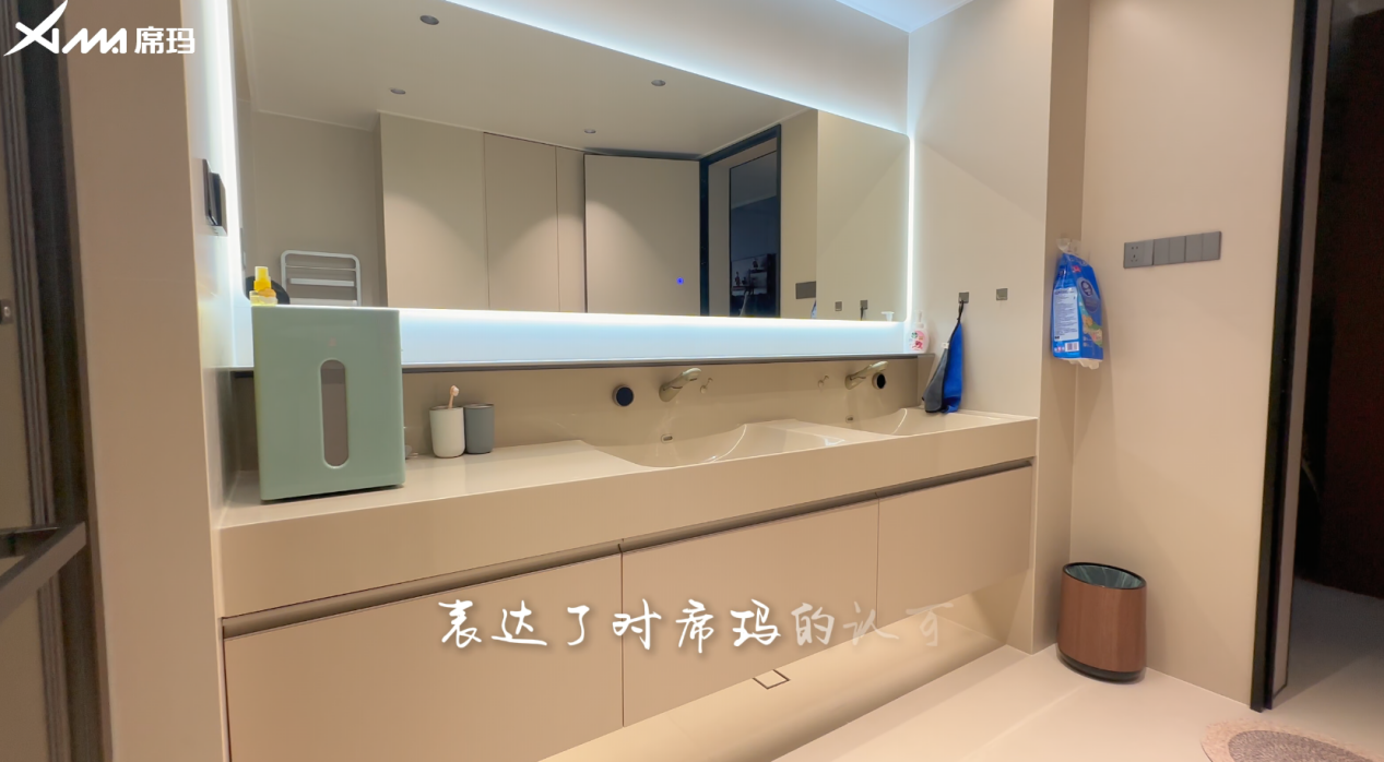唐先生新家的两个卫生间,都规划了超 2.6 米的超大台面,这对卫浴产品的选择提出了极高的要求,也曾让黎女士一度犯了难。“市面上常规的岩板台面,要做到2.6米,一般尺寸会选择卡到 2.4 米到 2.5 米之间,然后加上一定的吊边,这样的做法难免会留下缝隙,不仅破坏了空间的整体美感,还可能给后续清洁带来麻烦。”