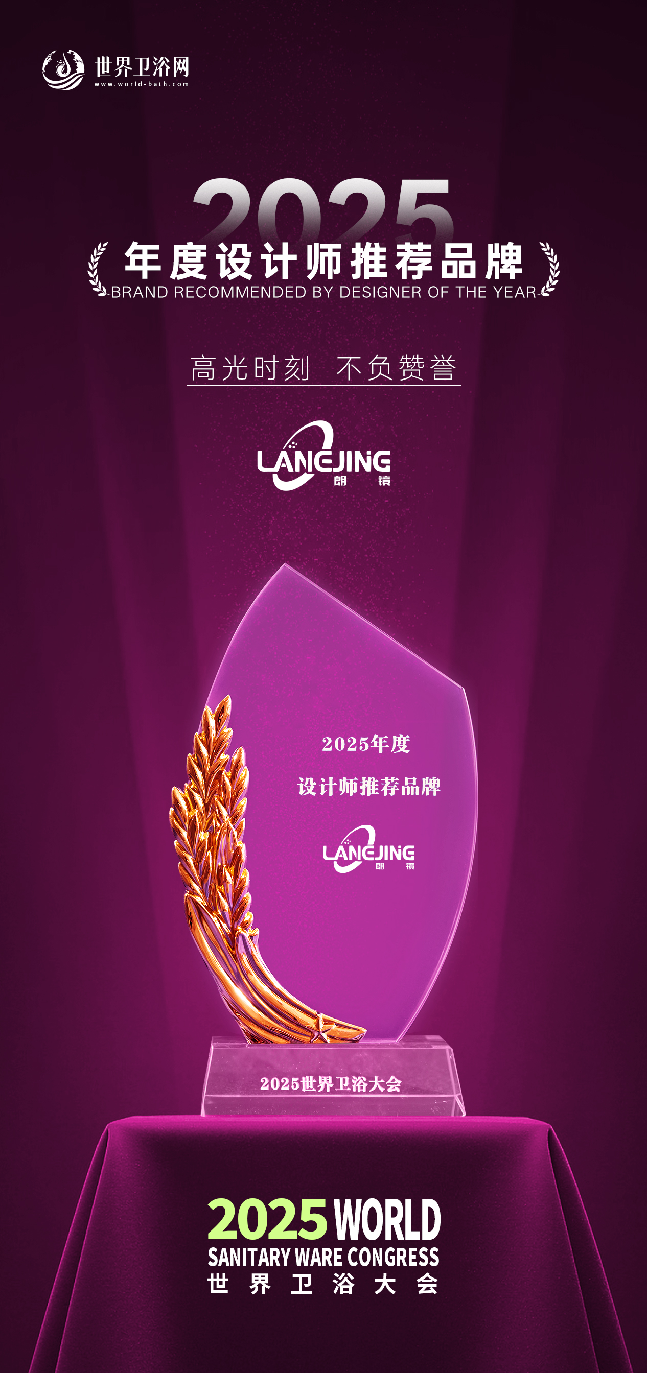 此次 “2025 年度设计师推荐品牌” 的荣誉加冕,是 2025 世界卫浴大会对朗镜设计理念、产品适配性与专业服务能力的高度肯定,更是广大设计师群体对品牌 “赋能空间设计、提升人居品质” 核心价值的深度认可。这一荣誉,不仅是朗镜品牌发展的重要里程碑,更印证了卫浴收纳细分赛道 “美学驱动 + 定制适配” 的行业趋势。