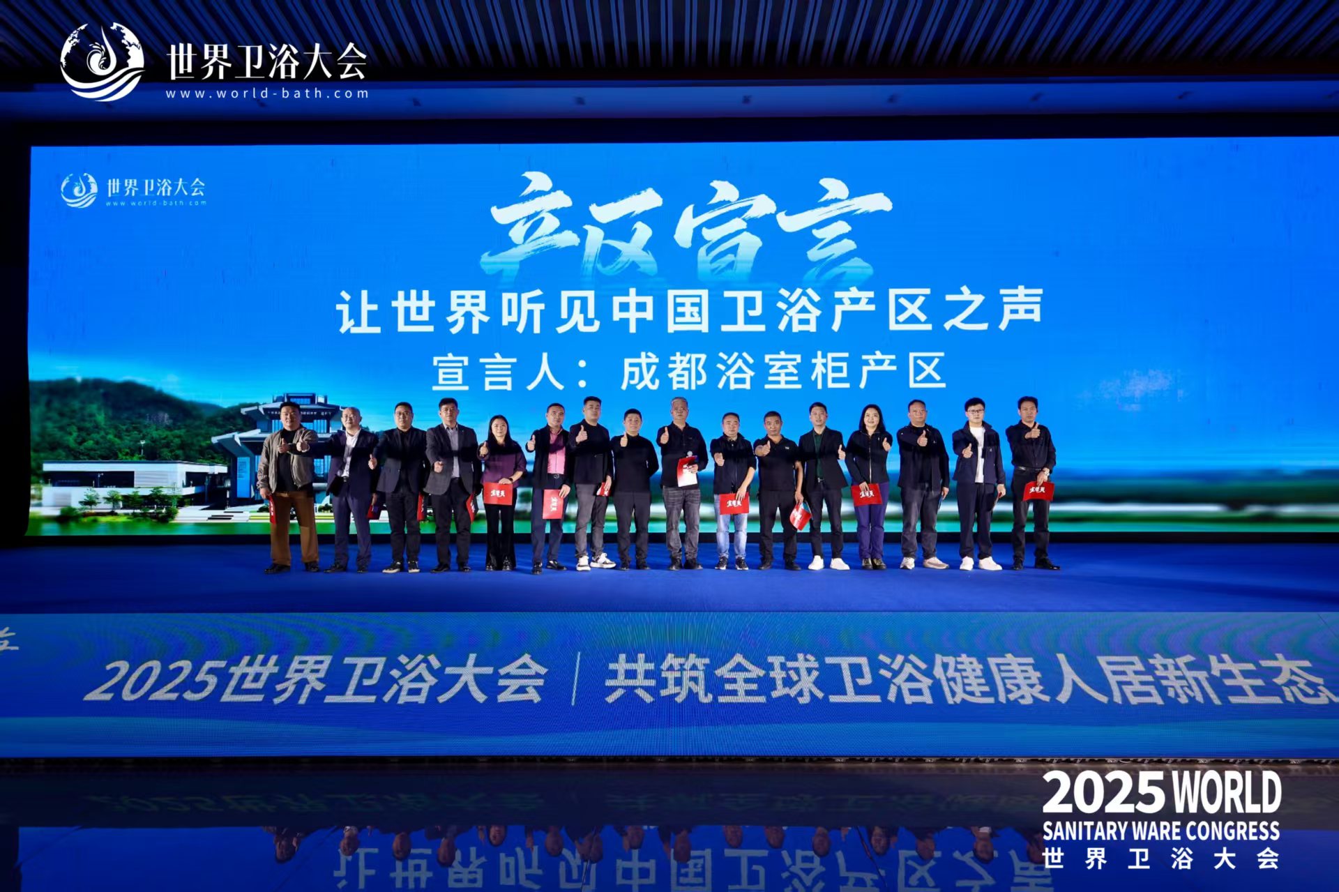 此次世界卫浴大会,为成都浴室柜产区IP的全球传播提供了绝佳契机。徐洪与其他产区代表共同宣读《成都浴室柜产业宣言》,从设计创新、品质把控、年轻定位等维度,向全球行业同仁展现了“成都浴室柜·厚德品质,好而不贵”的产业底气与发展决心,让世界清晰感知成都浴室柜的品质魅力与时尚活力,赢得了与会嘉宾的高度认可与广泛关注。