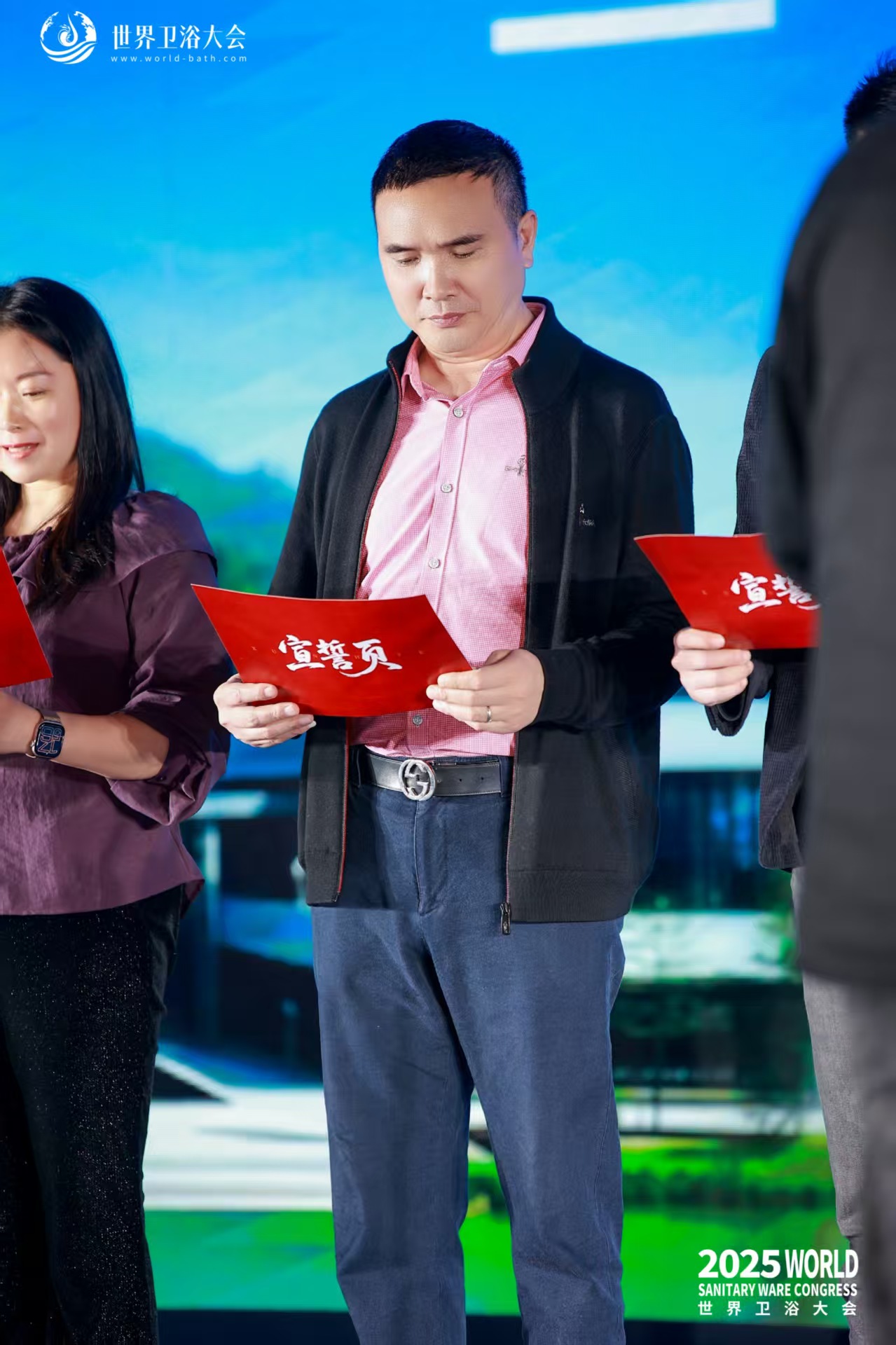 此次世界卫浴大会,为成都浴室柜产区IP的全球传播提供了绝佳契机。杨勋禄与其他产区代表共同宣读《成都浴室柜产业宣言》,从生产实力、品质把控、中高端定位等维度,向全球行业同仁展现了“成都浴室柜·厚德品质,好而不贵”的产业底气与发展决心,让世界清晰感知成都浴室柜的品质魅力与产业实力,赢得了与会嘉宾的高度认可与广泛关注。