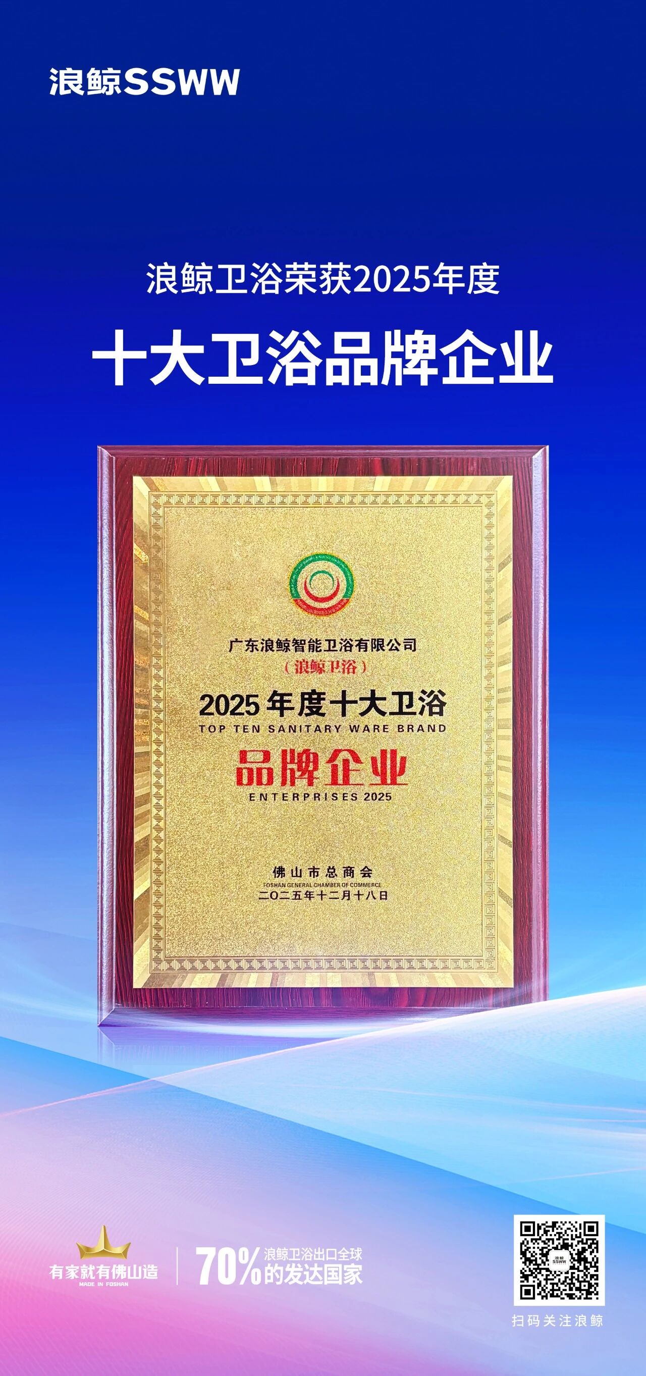 12月18日,2025第二十四届中国(佛山)民营陶瓷卫浴企业家年会在佛山圆满举行!本次年会主题为“跨界融合,探寻陶卫行业未来发展新方向”。浪鲸卫浴以卓越的品牌实力再获殊荣,被授予“2025年度十大卫浴品牌企业”荣誉。
