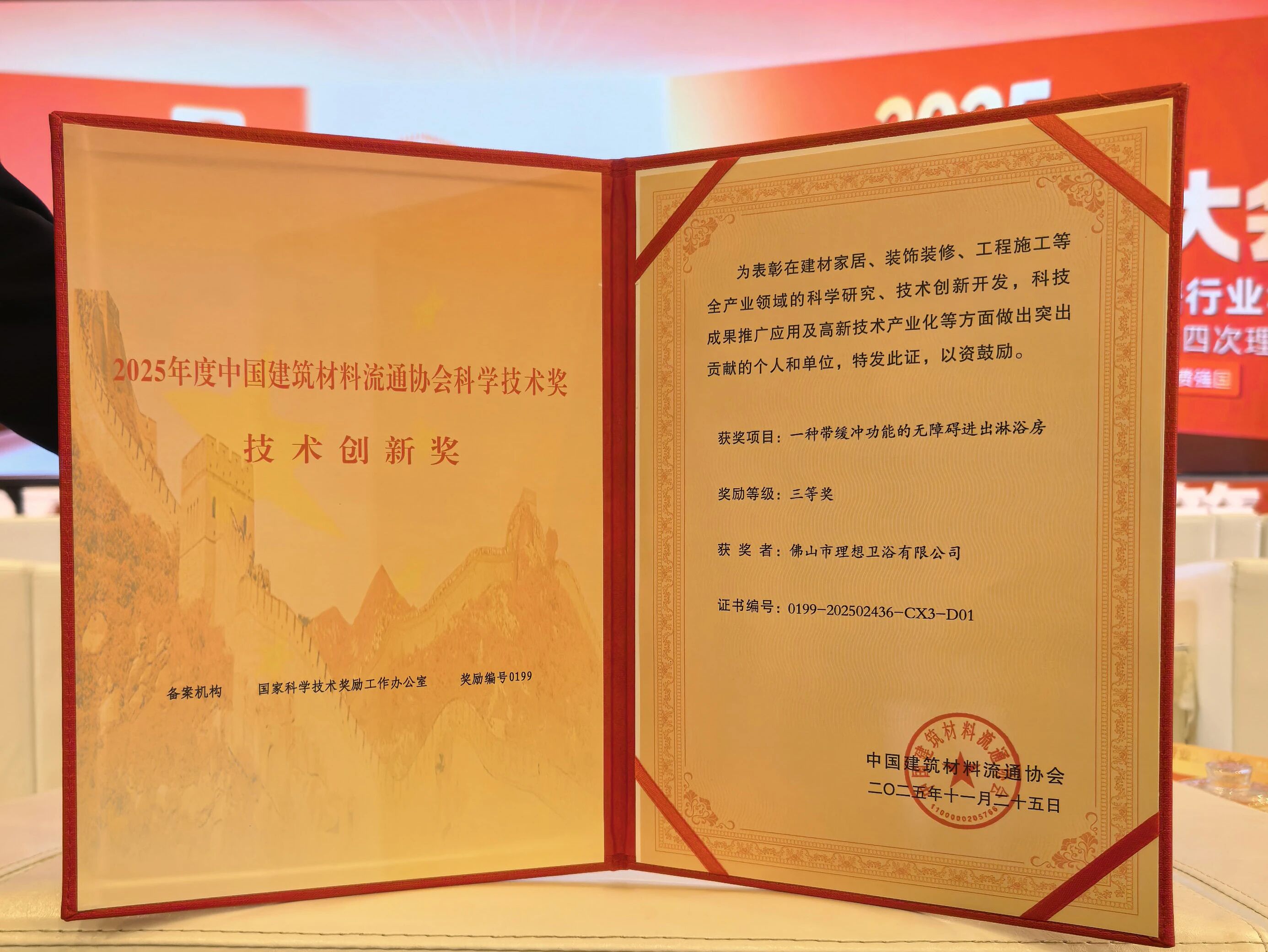 2025年12月10日,由中国建筑材料流通协会主办的建材家居行业的年度盛会——“2025行业之光大会”第34届全国建材与家居行业年会,在广东佛山盛大启幕。作为国际淋浴房领域的领军企业,佛山市理想卫浴有限公司受邀出席,凭借深耕淋浴门领域30余年的技术积淀与引领趋势的创新成果,一举斩获“高推广价值专利奖·金奖”及“技术创新奖·三等奖”两项重磅科技大奖,再次为行业的高质量发展树立了新标杆。