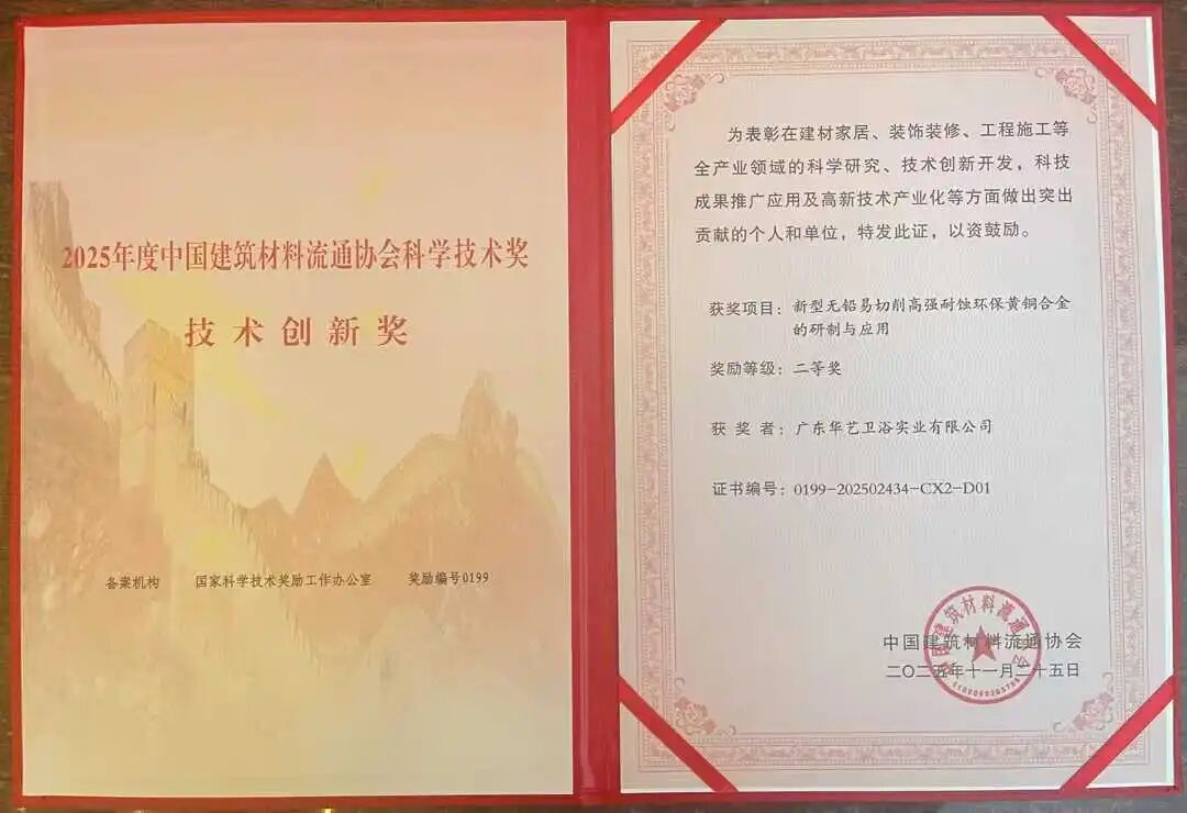 行业之光大会作为国内建材家居领域权威性行业峰会,聚集了全国数百家知名企业、行业专家及资深学者。奖项评选以 “技术突破性、市场价值性、行业引领性” 为核心标准,经过多轮严苛评审。华艺卫浴凭借《新型无铅易切削高强耐蚀环保黄铜合金的研制与应用》荣获国家技术创新二等奖的荣誉。