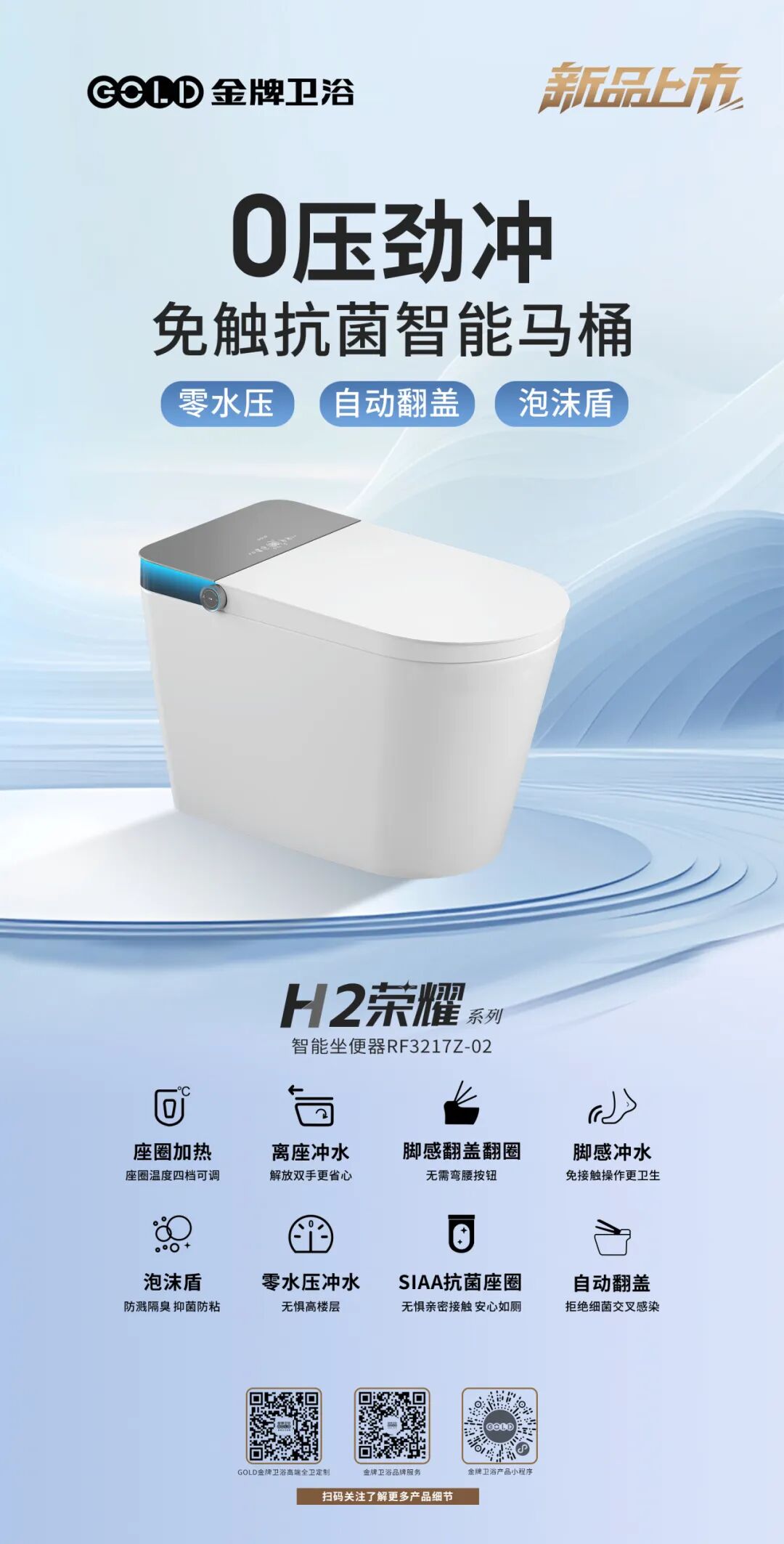 本次申报获奖的产品来自金牌卫浴旗舰产品——H2荣耀系列 RF3217Z-02 智能马桶,以多项迭代科技精准匹配用户需求:泡沫盾技术,加厚泡沫层厚度可达30mm,防溅锁臭,洁净不粘无尴尬;独立水压系统,无惧用户家庭用水环境,均可实现强力冲水;可视化数显屏:功能可视化、各项功能及温度数值状态一屏尽显,轻松掌握。