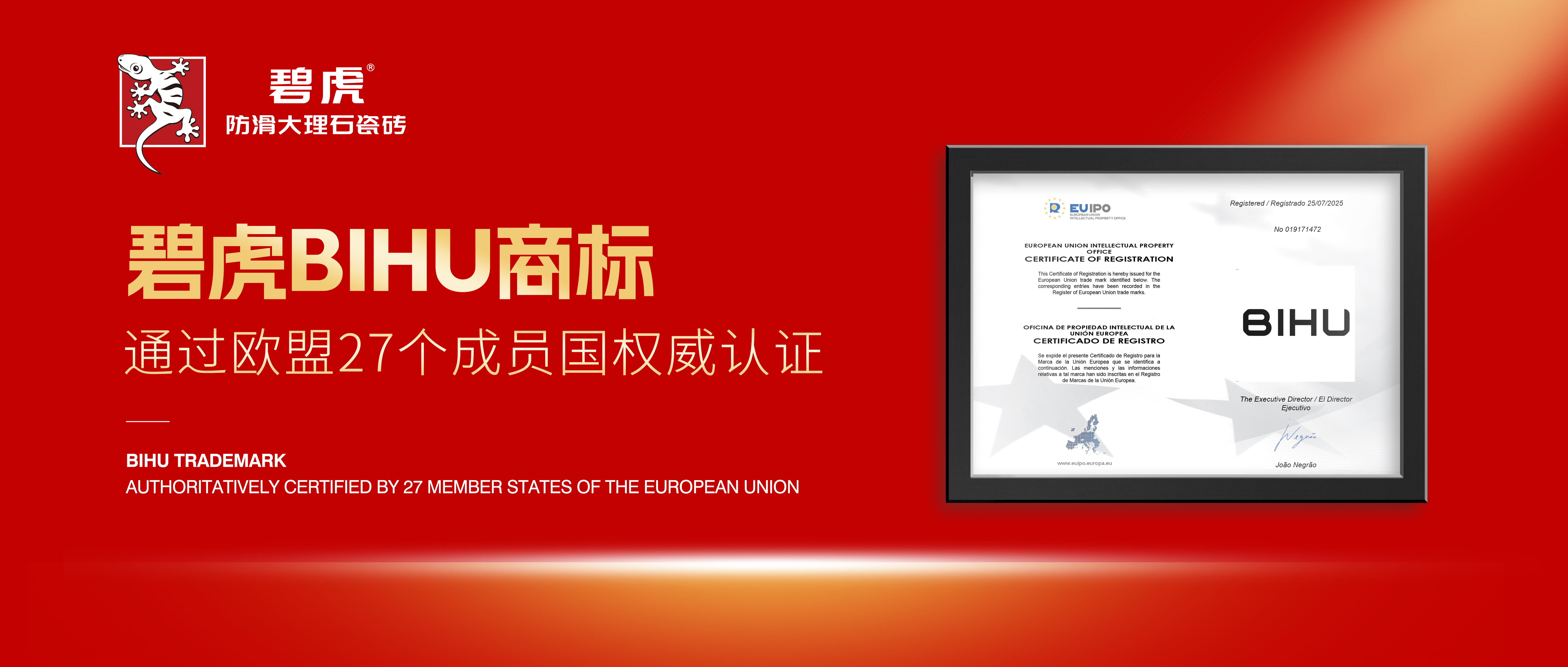 BIHU 商标获欧盟 27 国权威认证,品牌国际化布局迈出坚实一步,正式跻身全球防滑瓷砖主流市场。