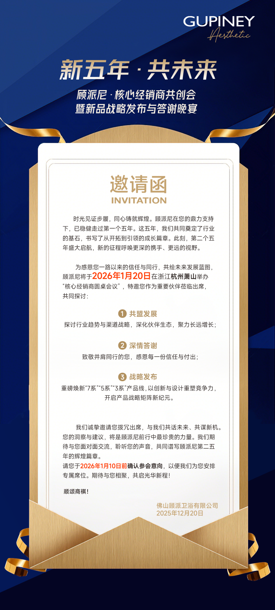 2026年1月20日,新年启元,万象更新,顾派尼“新五年·共未来”核心经销商共创会暨新品战略发布与答谢晚宴将在杭州萧山隆重举办。来自全球各地的经销商伙伴,将与顾派尼团队共襄盛举,携手开启新五年、新未来、新征程!