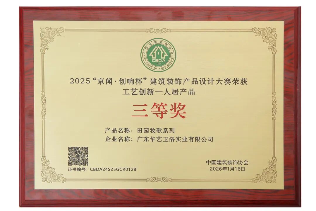 2026年1月16日,2025京闻·创响杯建筑装饰产品设计大赛颁奖典礼在全国人大会议中心隆重举行:华艺卫浴旗下“田园牧歌”浴室柜系列,凭借卓越的工艺创新与深厚的文化传承,从全国数百件优秀参赛作品中脱颖而出,荣获“2025京闻·创响杯建筑装饰产品设计大赛”工艺创新——人居产品三等奖。这一荣誉不仅再次验证了华艺卫浴的强大实力,更标志着其在文化传承与创新领域结出新的硕果。