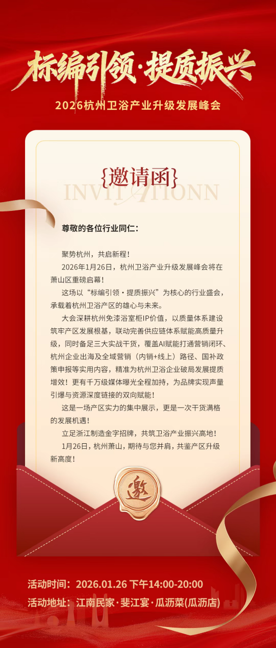 以宋韵为魂,以品质为基,以产区为傲。2026 年 1 月 26 日,以 “标编引领・提质振兴” 为主题的 2026 杭州卫浴产业升级发展峰会将在萧山盛大启幕。作为杭州浴室柜产区的领军企业、宋式美学卫浴的倡导者,柒登卫浴以协办单位身份深度参与此次行业盛会,携 “让世界看到中国的美” 的品牌初心与深耕行业的扎实积淀,与全行业同仁共探产区高质量发展路径,为杭州卫浴产业提质升级注入文化赋能与创新动能。