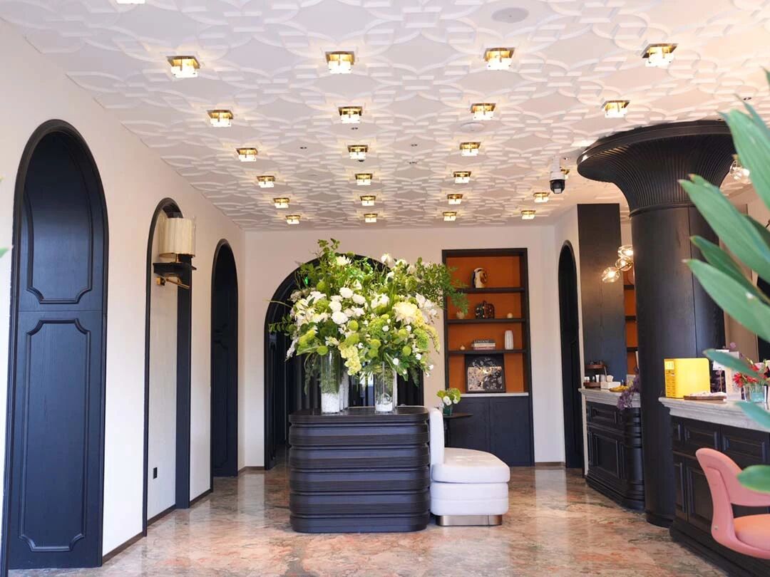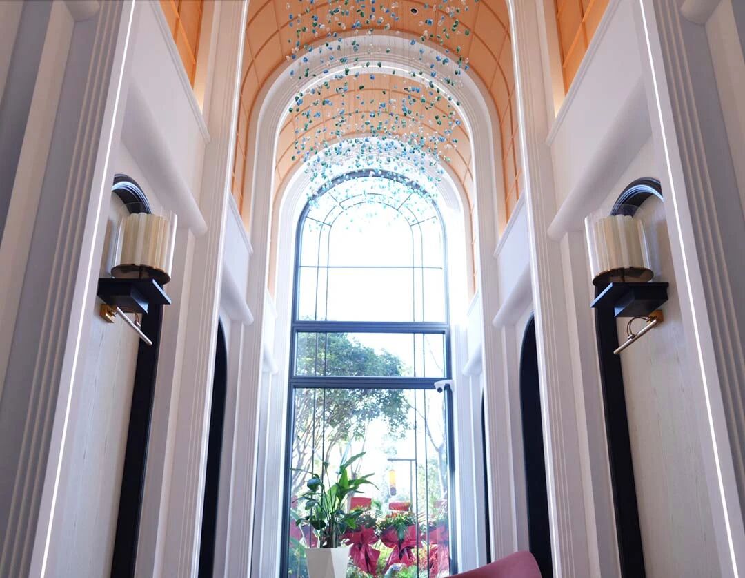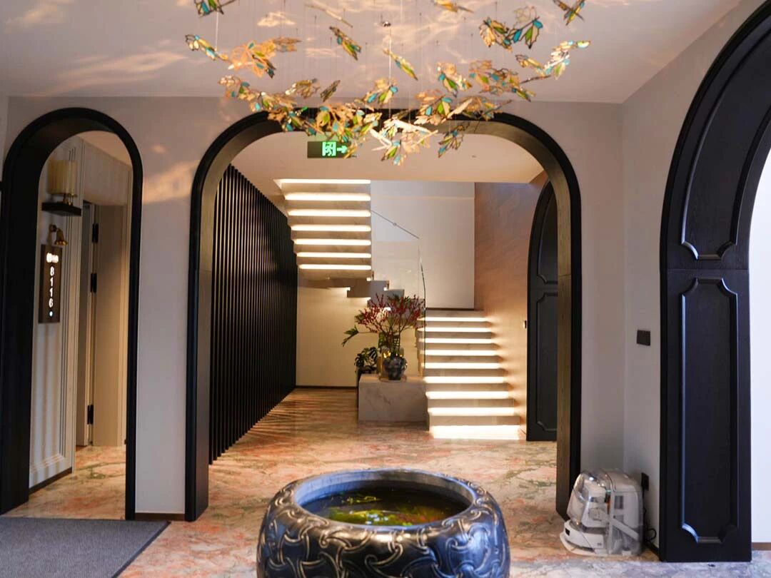 步入室内,轻法糅合新中式的氛围自然流露。黑色拱门与雕花石膏吊顶勾勒出利落轮廓,嵌入式筒灯、蝴蝶造型吊灯与蓝绿渐变玻璃装置错落排布,深色木质柜体、中式雕花水缸与鲜活花艺点缀其间,挑高拱形大窗将室外绿意尽收眼底,精致与松弛感恰到好处交织。