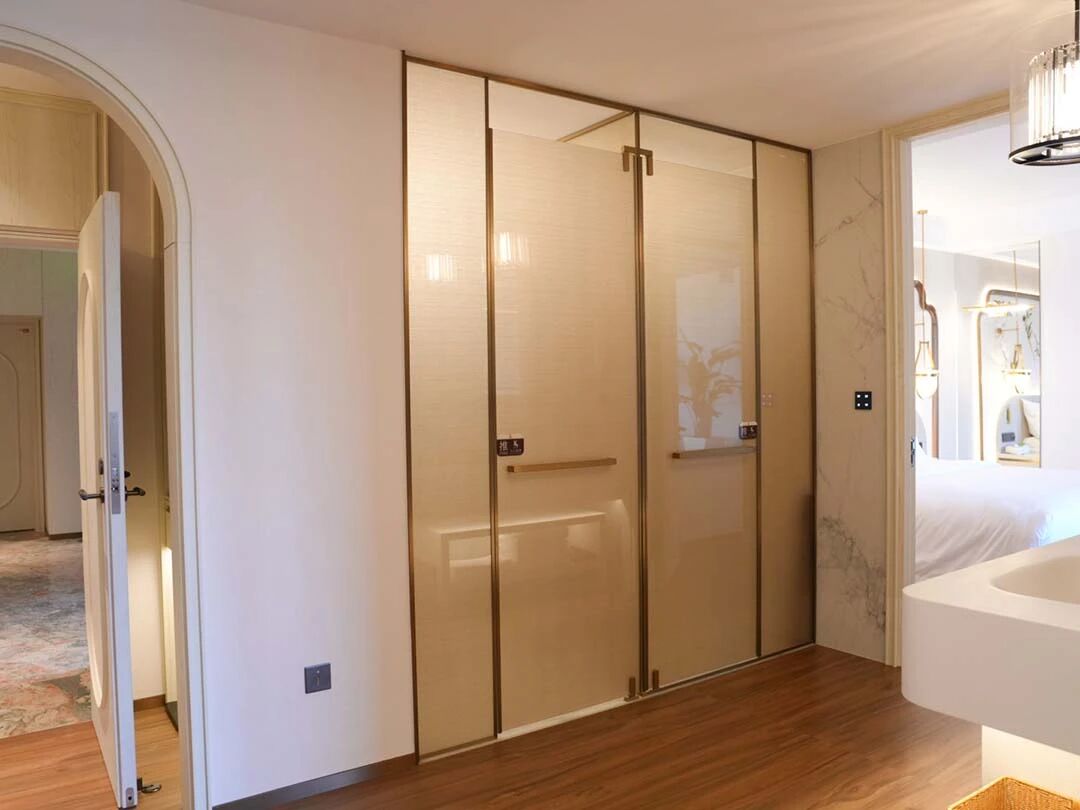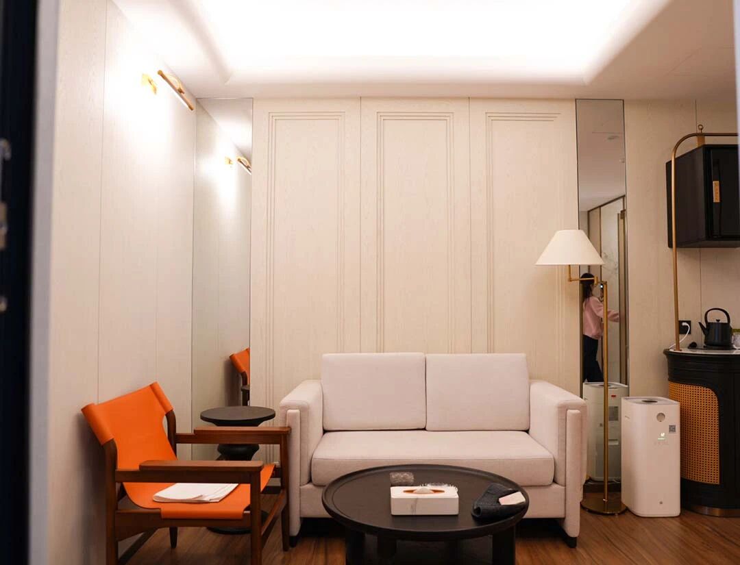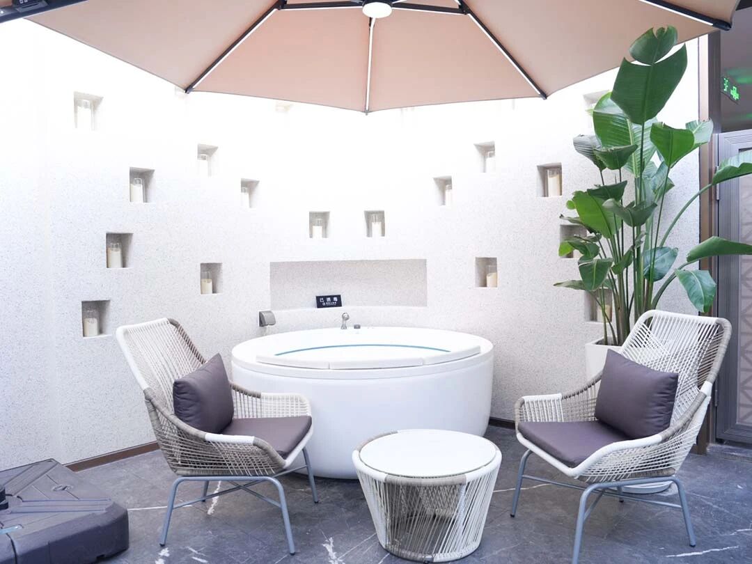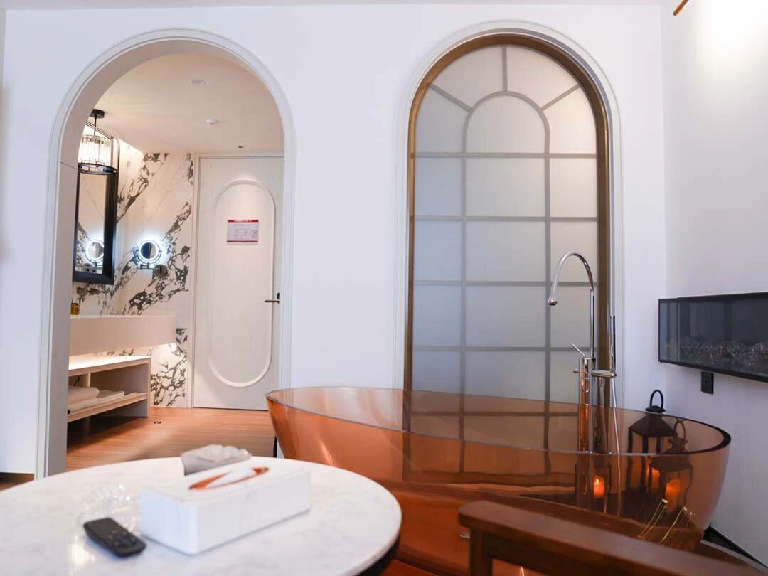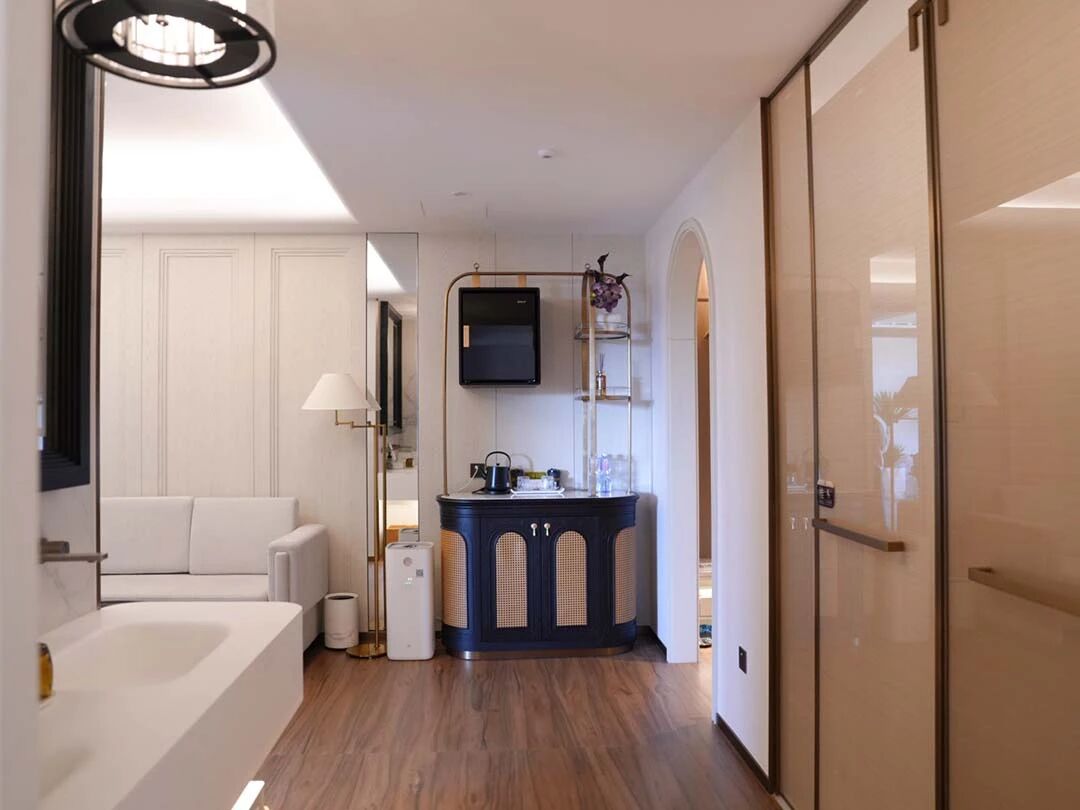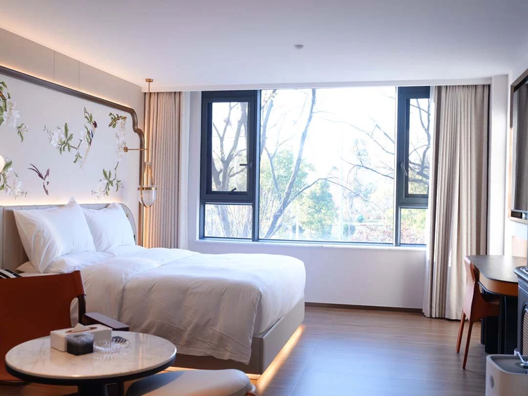 客房空间简净而有层次。一处庭院安静地位于客房之外,白色泡池与藤编休闲椅在绿植掩映间,营造出惬意的休闲角落。拱形门廊将空间自然过渡,搭配的实木边柜与中式几案,温润的木色为空间注入沉稳质感。卫浴空间内,铜色浴缸倚靠浅色墙面,拱形玻璃门以方形格条分隔,在引入光线的同时保持通透视野。卧室以花鸟刺绣背景墙点睛,浅木色地板延伸视觉,整面大窗将庭院树影自然纳入。法式形制与东方意境在此交融,共同织就宁静舒适的居住体验。