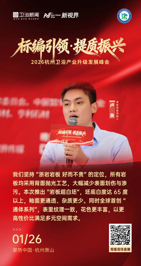 1 月 26 日,2026 杭州卫浴产业升级发展峰会隆重启幕,作为大会主办单位之一,深耕卫浴岩板领域的浙岩岩板以核心参与者姿态,深度融入这场以 “标编引领,提质振兴” 为主题的行业盛会。本次峰会汇聚行业权威、领军企业及创新力量,围绕产区未来、品牌进化与价值重构展开深度对话,既是行业智慧的巅峰碰撞,更是为 “杭州卫浴” 集体品牌注入强劲动能、擦亮 “浙江制造” 金名片的战略行动。