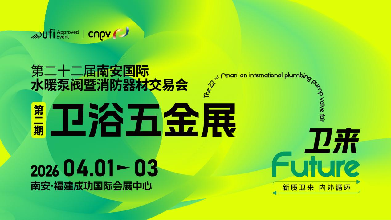 4月1日至3日,第22届南安卫浴五金展(2026CNPV)将在南安会展中心盛大启幕。作为享誉行业的卫浴五金供应链旗舰展,南安卫浴五金展历经20多年沉淀,现已成为全国同类展会中极具影响力、强供应链属性的国际性专业展会。本届展会做为“焕新”序章,以“卫来”为主题,携8大主题、7大展馆、1100+国际标准展位、10+同期活动,为行业带来一场酣畅淋漓的盛宴!