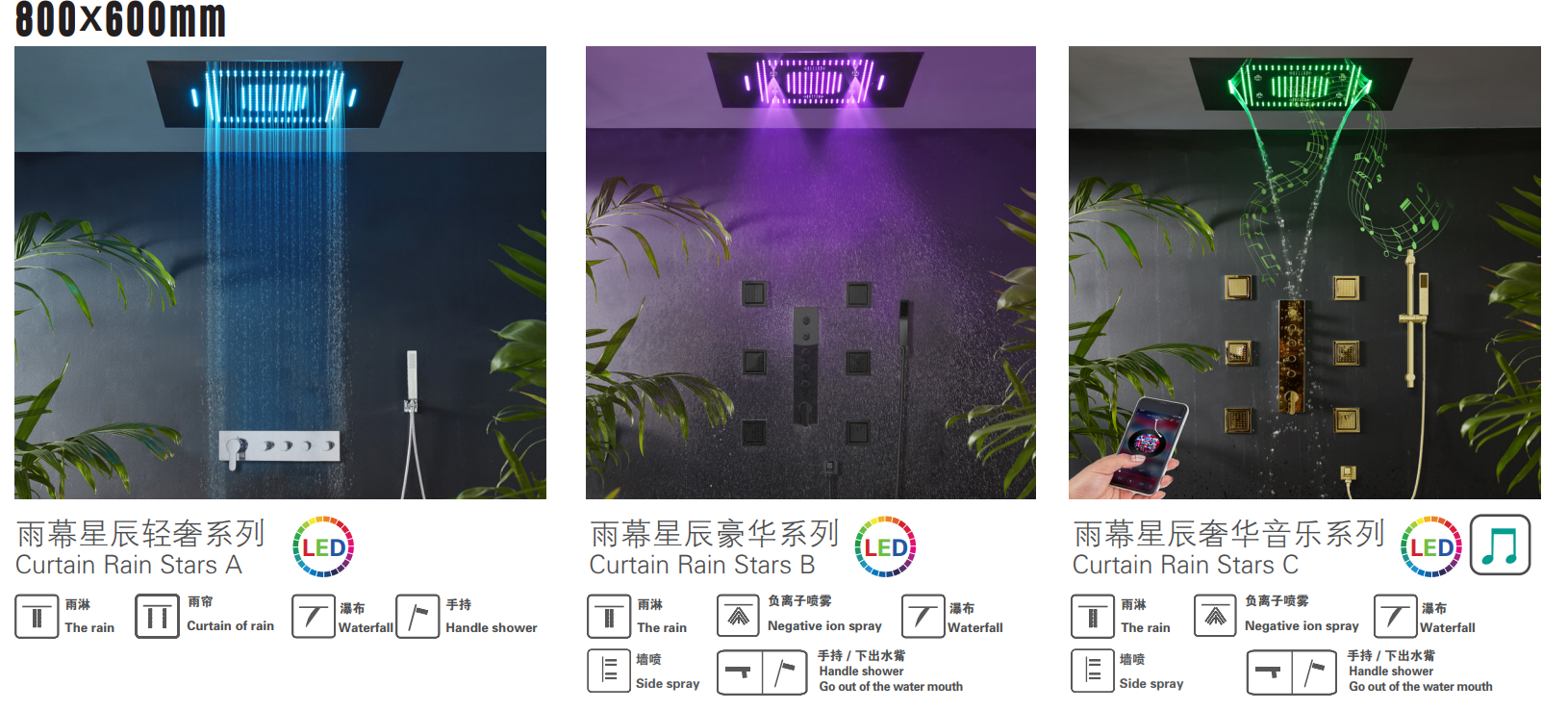 浴旺品牌 部分产品(雨幕星辰800*600智能LED暗装音乐多功能情调淋浴系列)