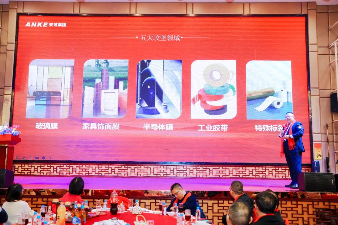 面向2026,董事长强调,安可将坚定贯彻“筑基攻坚,组织跃迁”的战略主题,持续加大研发、开拓市场、强化管理、凝聚团队,聚焦深耕玻璃防爆膜、板材饰面膜、3C半导体显示膜、工业胶粘、标签材料五大核心领域,筑牢发展基石。