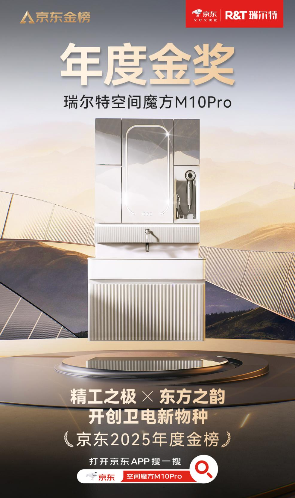 近日,在京东金榜2025年度盛典上,瑞尔特新物种浴室柜“空间魔方M10 Pro”凭借卓越的设计创新力与市场口碑,斩获“年度金奖”,与美的、小米、华为等品牌单品一同入选京东金榜。这一奖项不仅彰显了瑞尔特在智能卫浴行业的领先地位,也印证了京东金榜作为权威消费指南对高品质商品的严格甄选。