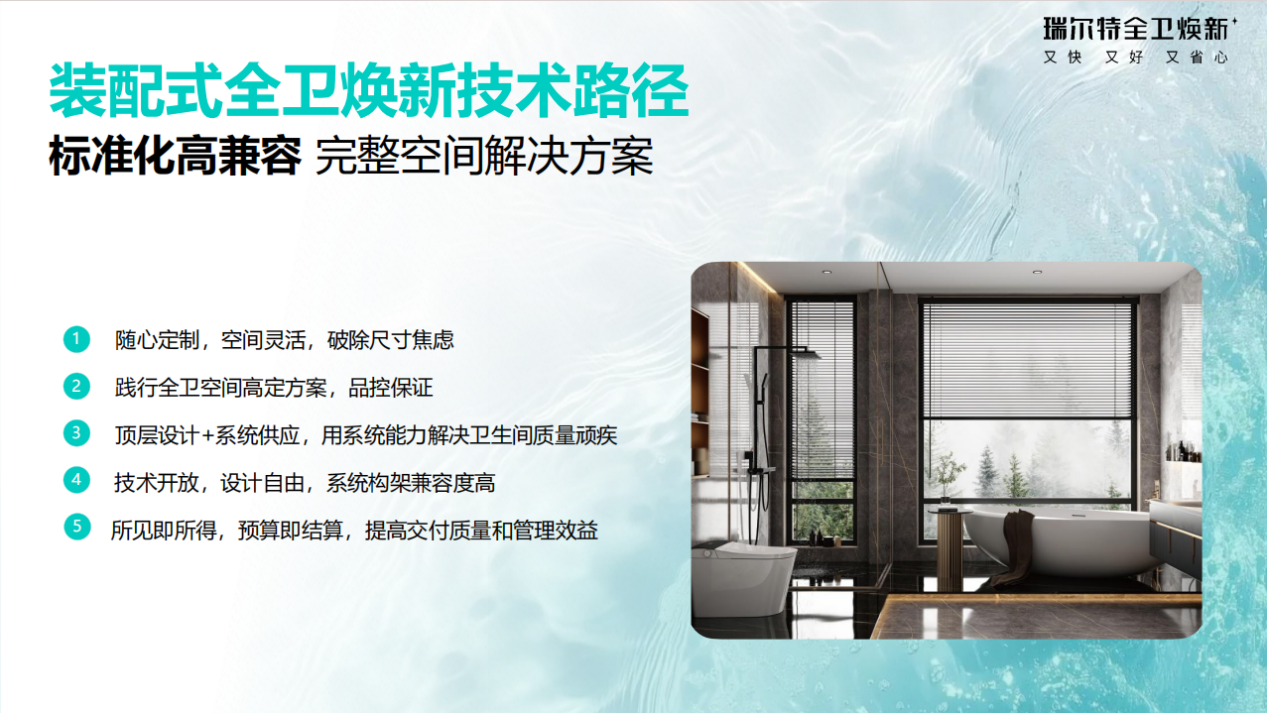 针对传统卫生间改造中“灰尘大、工期长、噪音扰民”的普遍痛点,瑞尔特创新性地推出了装配式整体卫浴解决方案。该方案将复杂的卫浴空间化繁为简,集成吊顶系统、给水排水系统、底盘系统等6大系统,安装效率较传统施工提升数倍,即装即用,一站交付。这种 “又快、又好、又省心” 的全卫焕新能力,让消费者无需搬家即可实现卫浴空间的品质跃升,极大地降低了存量房时代家庭改善居住环境的决策门槛。