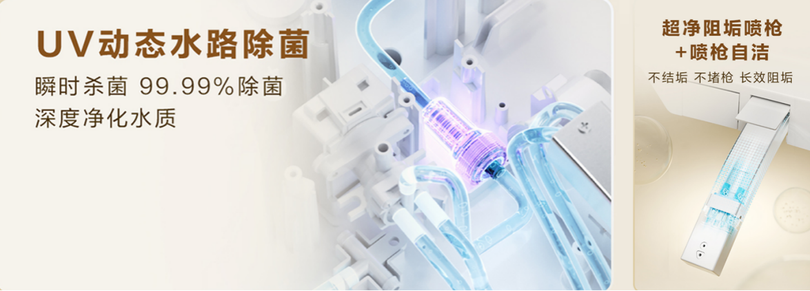尤为体贴的是,针对女性生理期等特殊场景,T60通过前置超精过滤、UV水路杀菌、阻垢喷枪及喷枪UVC紫外线杀菌、电解水喷淋抑菌等多重科技协同,实现了更具针对性且连续不断的净菌防护。