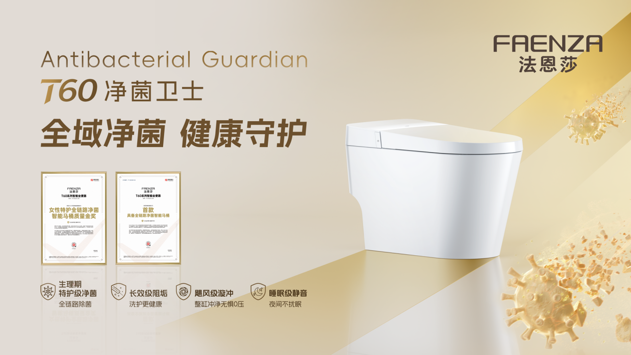 以法恩莎卫浴T60净菌卫士智能坐便器为例,它凭借硬核净菌实力斩获“家居质量界的奥斯卡”——沸腾质量双料大奖:【首款具备全链路净菌智能马桶】与【女性特护全链路净菌智能马桶质量金奖】,其外观以流畅而克制的线条构建整体轮廓,兼顾现代审美与空间适配度,在功能上则聚焦用户长期关注的如厕卫生问题,搭载专研「全域净菌系统」,从抗菌座圈、水路除菌、喷枪阻垢、水封抑菌、离座自洁,实现全链路、全流程、全方位健康守护。