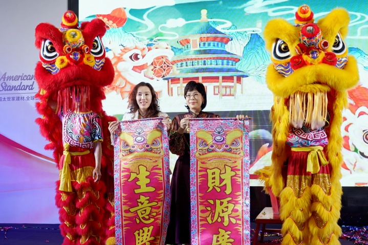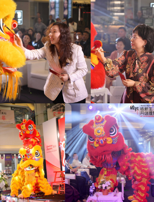 随后的舞狮点睛仪式将现场气氛推向高潮。国太世家建材创始人吴瑛女士与富森美家居联合创始人刘云华女士共同为瑞狮点睛,寓意国太世家美标旗舰店开业大吉、生意兴隆、财源广进。
