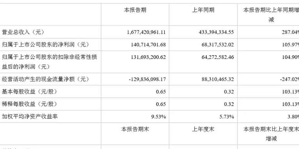 道氏技术8月23日公告,2018年上半年,公司实现营业收入167742.10万元,较上年同期增长287.04%;实现归属于上市公司股东的净利润14071.47万元,较上年同期增长105.97%。公告称,上半年,公司继续专注于开拓新能源材料业务,形成了新能源材料和陶瓷釉面材料共同创新、协同升级的优势竞争力,体现了公司的技术价值和市场价值。其中,佳纳能源实现营业收入117746.37万元、净利润21183.44万元,对公司的业绩贡献巨大。
