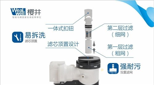 进水阀用久了,都会变脏,可又不知如何拆滤芯,樱井这次创新推出滤芯顶置水件,将滤芯设置在进水阀的顶部。当用户需要拆洗滤芯时,只需打开水箱盖子,扭开进水阀顶部的一体式开关,便可轻松将滤芯拆出清洗。