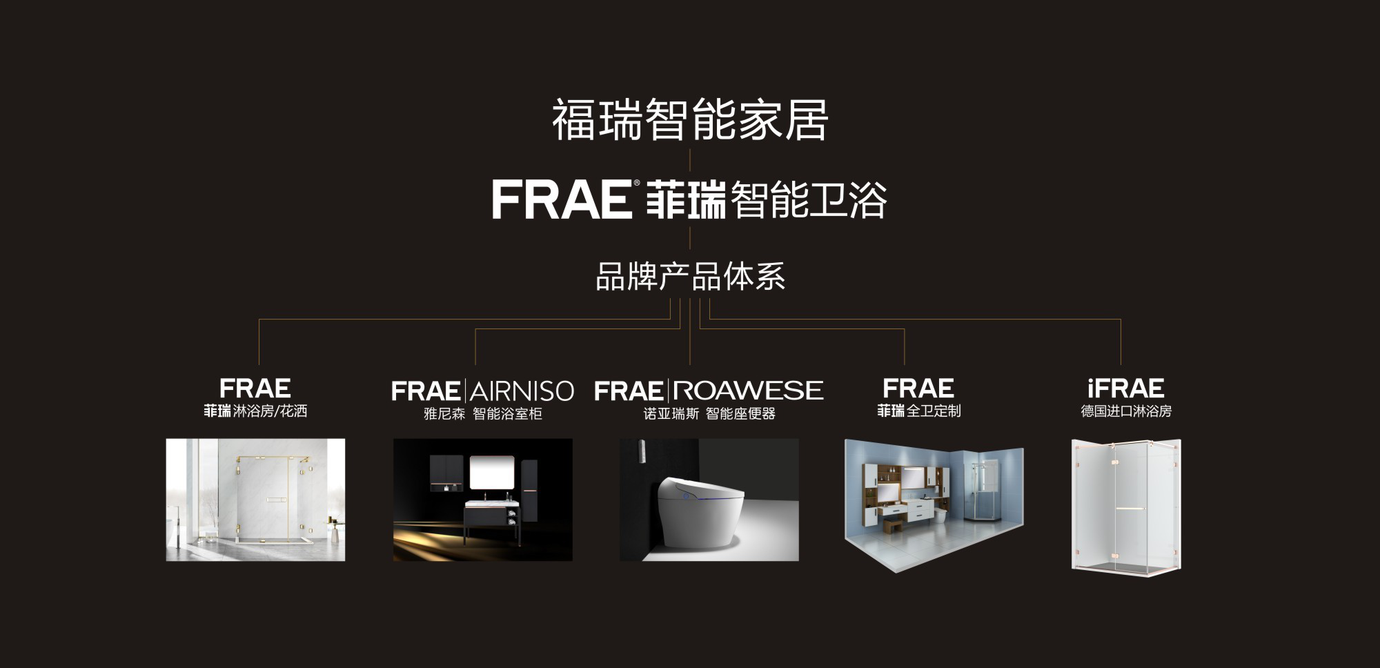 品牌升级后,菲瑞品牌产品体系从FRAE菲瑞淋浴房与花洒、AIRNISO雅尼森智能浴室柜、ROAWESE诺亚瑞斯智能马桶、FRAE菲瑞全卫定制、iFRAE德国进口淋浴房,形成完整的智能高端,全卫定制产品体系。