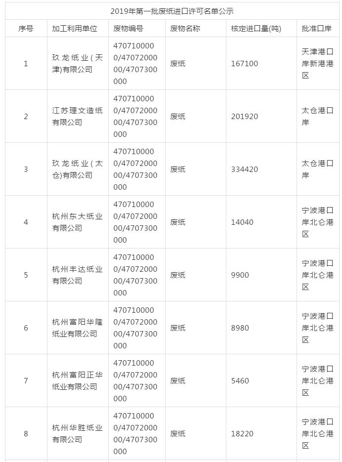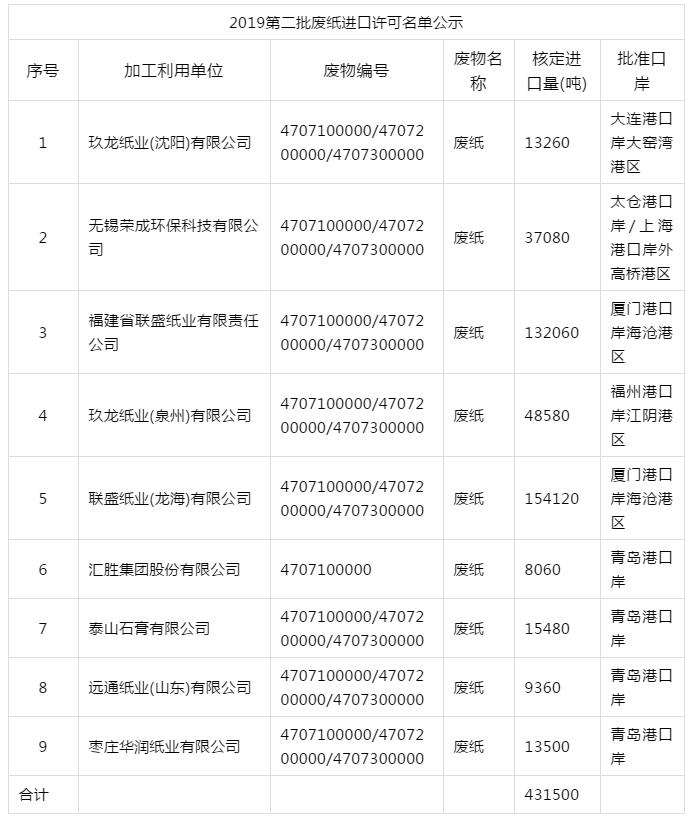 三、2018年12月29日,环保部公示了2019年第二批固体废物原料进口许可证获批名单。此批名单一共公示9家废纸加工利用企业,废纸核定进口总量为43.15万吨。