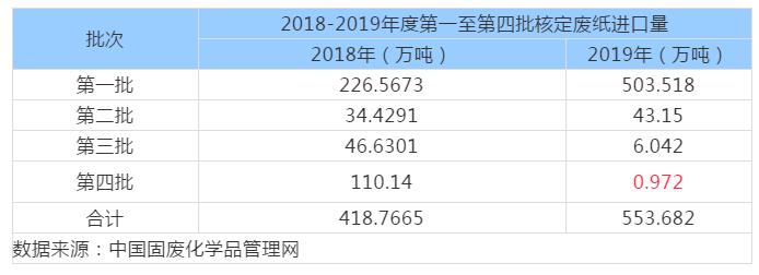 一、2月19日,中国固化废管理网发布2019年度第四批次外废进口申请明细表。本批次仅江苏富星纸业有限公司1家纸企获批,核定进口总量为9720吨。