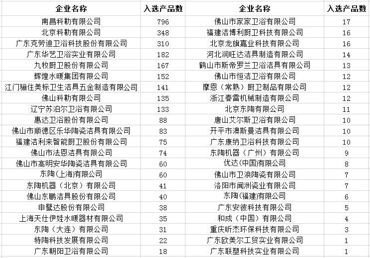 其中,入选产品数量最多的是南昌科勒有限公司,达796件。入选产品数量超过100件的还有:北京科勒有限公司、广东克劳迪卫浴科技股份有限公司、广东华艺卫浴实业有限公司、九牧厨卫股份有限公司、辉煌水暖集团有限公司、江门骊住美标卫生洁具五金制造有限公司、佛山科勒有限公司、辽宁苏泊尔卫浴有限公司。