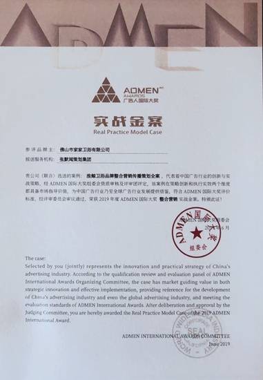 本次获奖的浪鲸卫浴品牌整合营销传播策划全案,是牵手张默闻全案策划集团合力从品牌形象、市场布局,营销策略等方面进行全面升级。案例赢得主办方的高度认可:案例代表着中国广告行业的创新与实战策略,经ADMEN国际大奖组委会资质审核及评审团评定,该案例在策略创新和执行实效两个维度都具备市场指导价值,为中国广告行业乃至全球广告行业发展提供借鉴的重要意义。