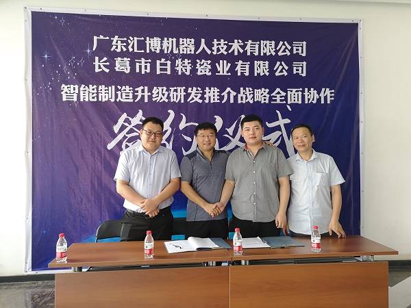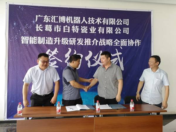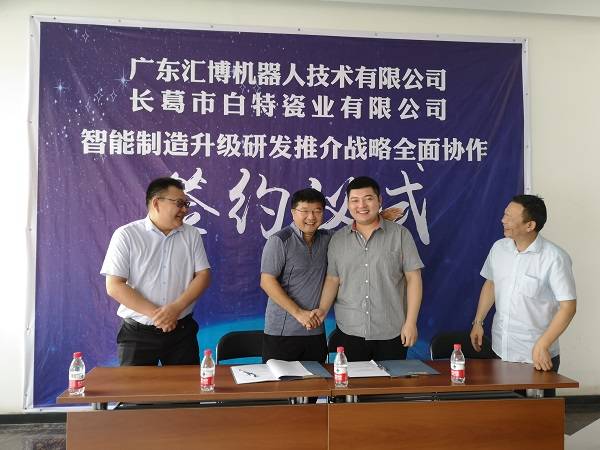 6月27日,长葛市白特瓷业有限公司与广东汇博机器人技术有限公司在双方公司代表的见证下,举行了较为正式的智能制造升级研发推介战略全面协作的签约仪式,白特瓷业董事长侯孝华与汇博机器人董事长秦磊作为双方签约代表,共同出席了本次签约仪式。
