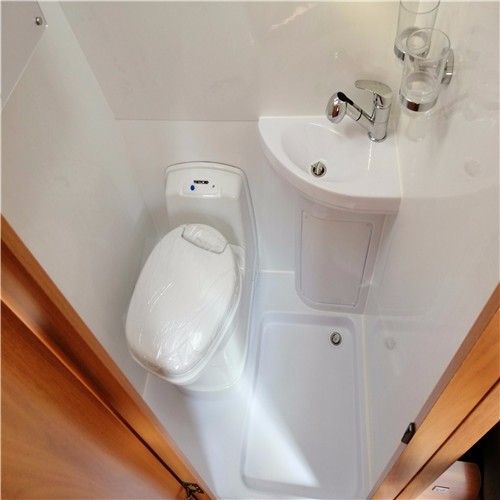 卫浴间整体采用白色一体式环保性吸塑材料,具有良好的密闭性,独立的凹槽式地板钉在房车地板上可对木质地板进行良好的保护,卫浴间内部有着赛特福德可旋转方向的坐便器,淋浴洗手一体化喷头,毛巾架、小柜镜还有排风扇相当齐全。