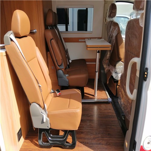 大通原厂B型房车的客厅区采用高级沙发座椅和大理石餐桌装配,整体看上去会非常的有格调,该座椅采用多功能调节设计,靠背可进行一定角度倾斜,头枕也可以升降,这样可使座椅针对不同身高的用户皆适用,而且座椅的两边都有扶手,非常细心的设计。