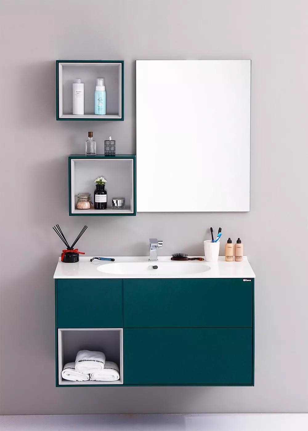 这款浴室柜在设计上打破了传统的造型,几何方框的设计和色彩巧妙的搭配在一起,一维收纳防尘柜方便置物和拿取,整体增加了多种收纳的方式,能够满足不同的收纳去求,简约的柜体设计,搭配高雅的绿色让空间极具高级感。
