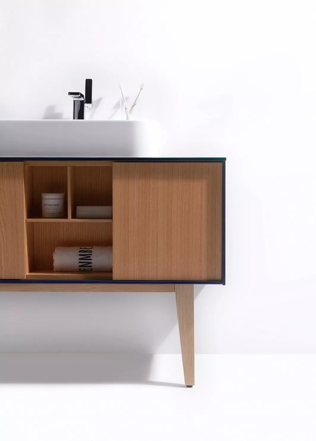 这款拼色的浴室柜看似小巧,但在造型的打造上,很好的将设计感与功能性进行巧妙融合。宝石蓝的线勾勒出整体的框架,营造出简约而不简单的视觉感,柜脚的灵感来自高跟鞋的优雅造型,原木色很好的体现了浴室柜的质感,与宝石蓝的线条相应成趣。