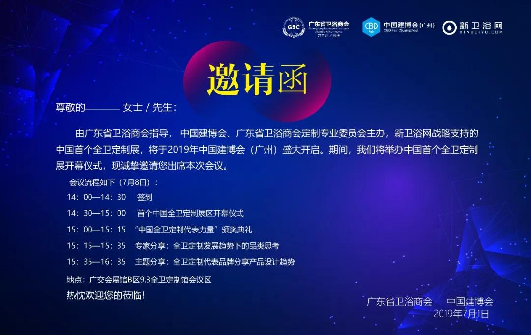 中国首个全卫定制展,将于2019年中国建博会(广州)盛大开启。期间,我们将举办中国首个全卫定制