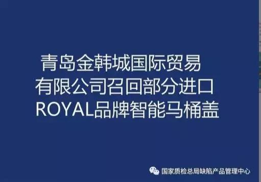 韩国青岛金韩城公司向国家质检总局提交了召回计划,召回部分进口ROYAL(乐雅)品牌智能马桶盖。本次召回产品涉及的型号为RB3250,生产日期在2017年2月期间,原产国为韩国。据该公司统计,中国大陆地区受影响的产品数量共计18台,因该产品存在多处安全隐患。